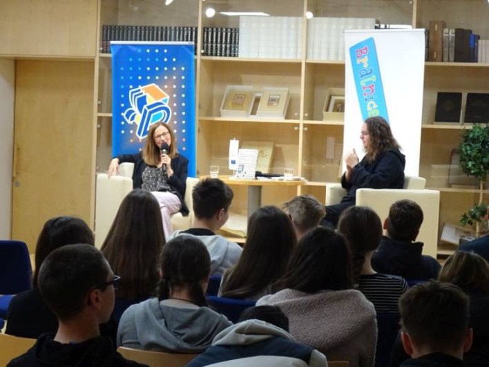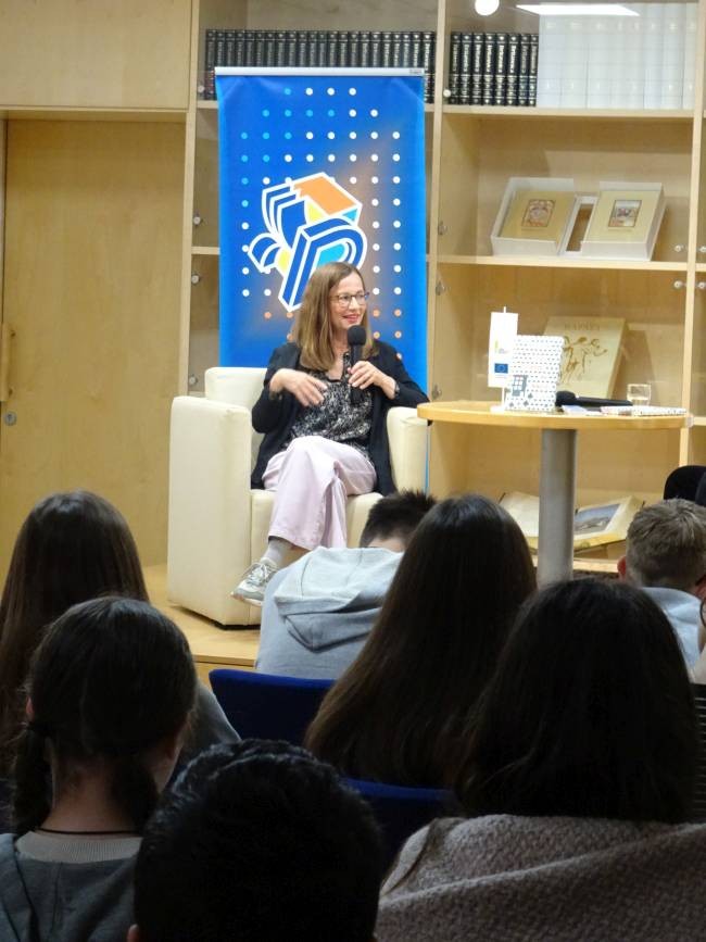 V maju pa so se nam dvakrat pridružili učenci OŠ Venclja Perka. Spoznali so dansko pisateljico Mette Vedsø, ki se je predstavila z mladinskim romanom 130 utripov na minuto. Roman je presunljiv roman o tesnobi, pa tudi ganljivi moči povezane skupnosti, ki se razvije na Pijinem domačem stopnišču. Z avtorico se je pogovarjal Gašper Stražišar. Veseli smo, da se je avtorica ob obisku Slovenije ustavila tudi v naši knjižnici.