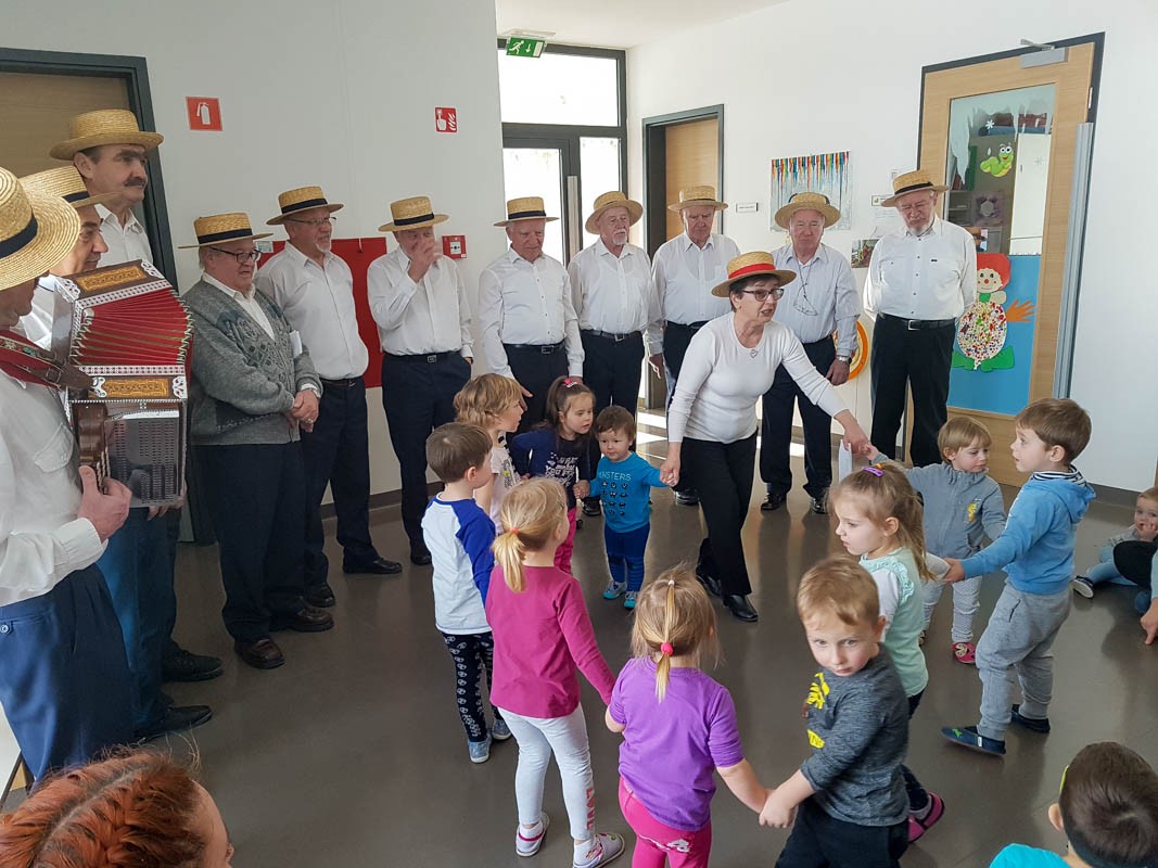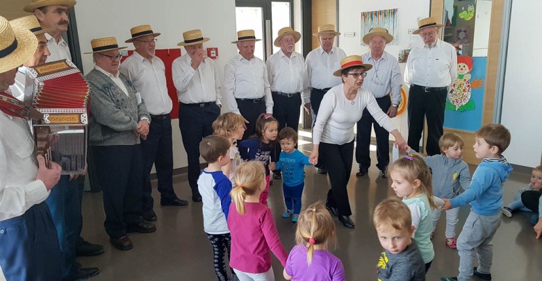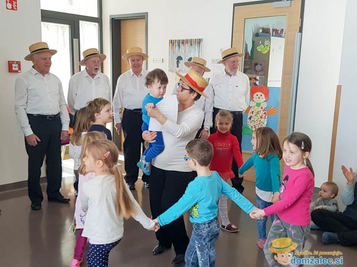 Kot so se včasih zbrali v topli izbi, ob zakurjeni krušni peči, smo se tudi otroci in strokovni delavci zbrali v velikem številu v večnamenskem prostoru in prisluhnili ubranemu petju moških glasov pod vodstvom gospe Marike Haler in ljudskega godca, ki je ubrano spremljal ljudske pesmi s harmoniko, na glavi pa so imeli tradicionalne domžalske slamnike.