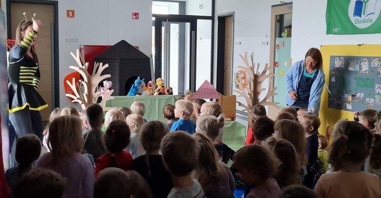 Tako smo dan pred samim zajtrkom vzgojitelji pripravili lutkovno predstavo z naslovom »Kako je čebelica rešila zajčka«.