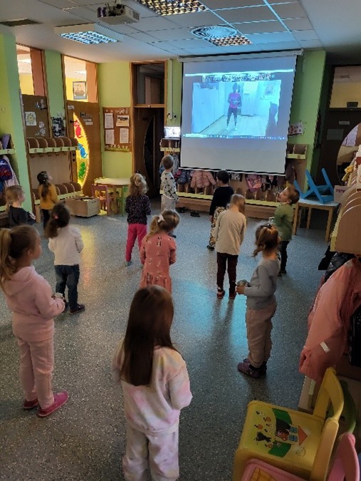 Vse enote se gibajo in izvajajo različne gibalne dejavnosti z različnimi pripomočki, hkrati pa sodelujejo vse enote preko aplikacije Zoom. Katja v eni enoti izvaja gibalno dejavnost, ostali pa se povežejo preko Zooma in prav tako istočasno izvajajo gibalno dejavnost.