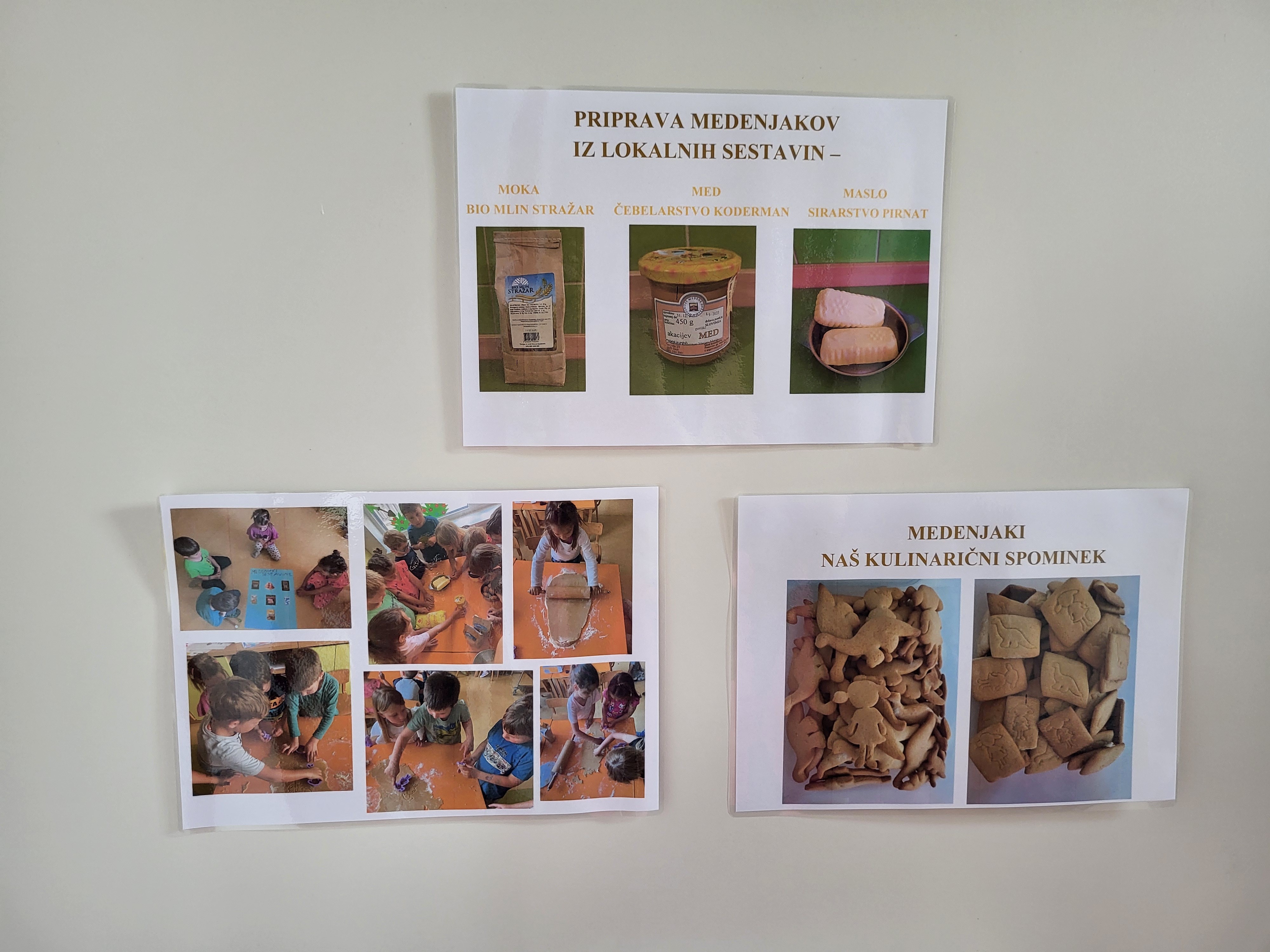 Pri peki medenjakov (našemu kulinaričnemu spominku), smo skupaj z otroki iskali recept o pripravi medenjakov. Otroci so izdelali plakat s koraki in sestavinami peke medenjakov. Skupaj smo tudi raziskovali kje in kako sploh dobimo sestavine, da lahko naredimo medenjake. Moko smo dobili v Bio mlinu Stražar, gospa iz sirarstva Pirnat nam je v vrtec prinesla maslo, čebelarka ga. Koderman pa nam je med podarila, ko je bila novembra na obisku, ko smo imeli tradicionalni slovenski zajtrk in smo se pogovarjali o čebelah.