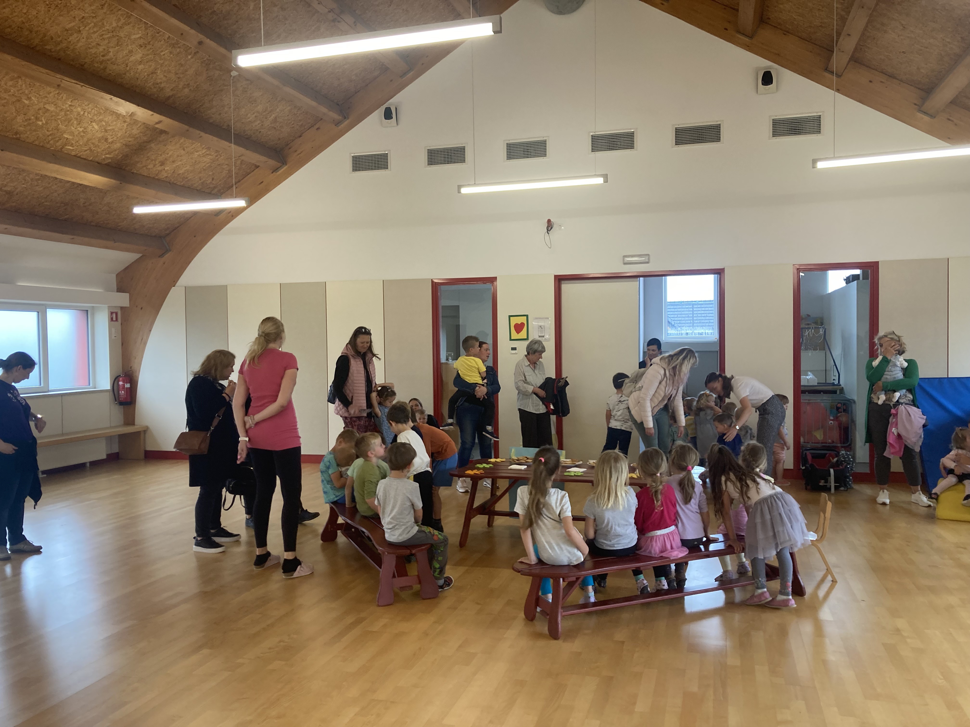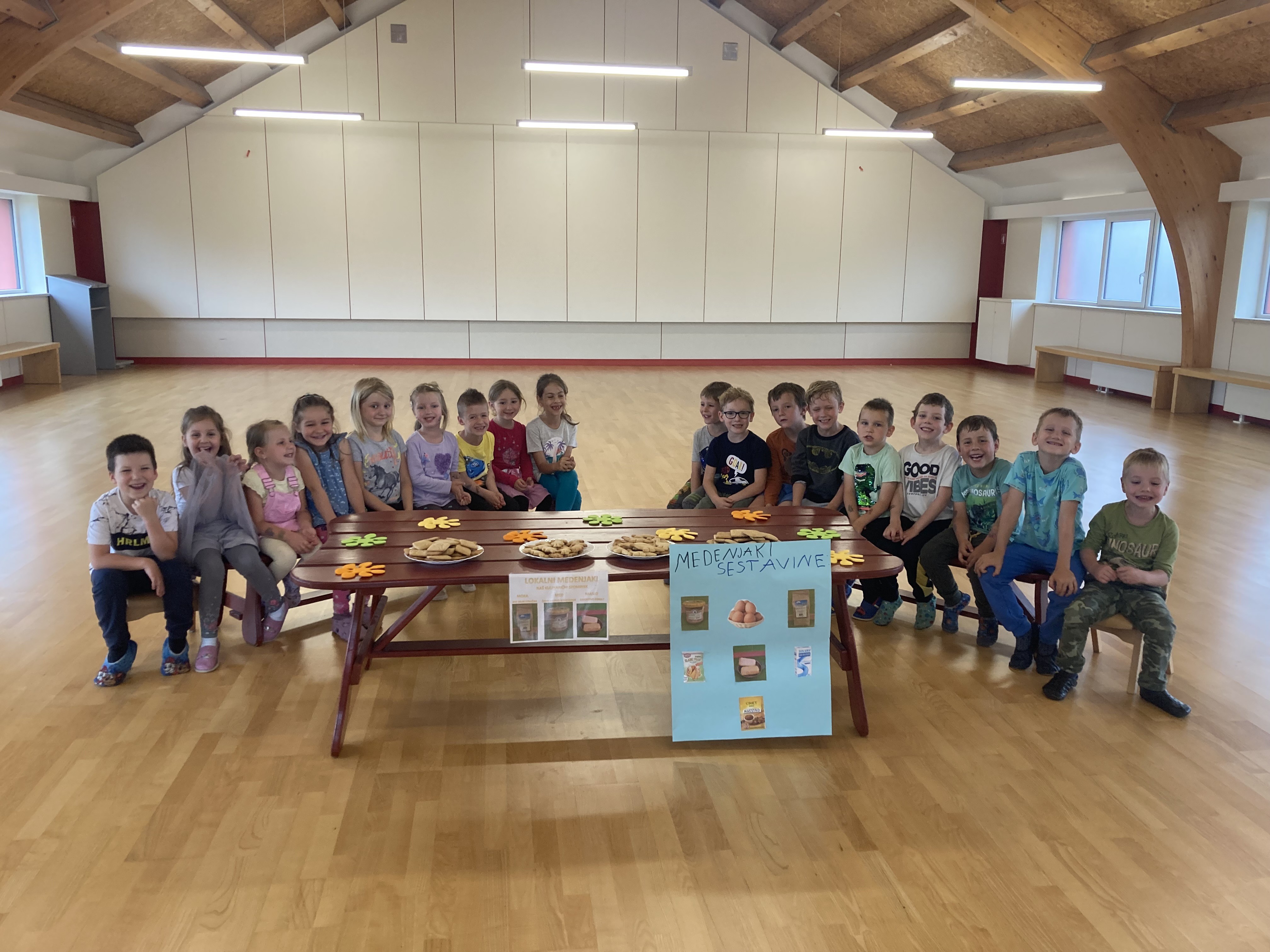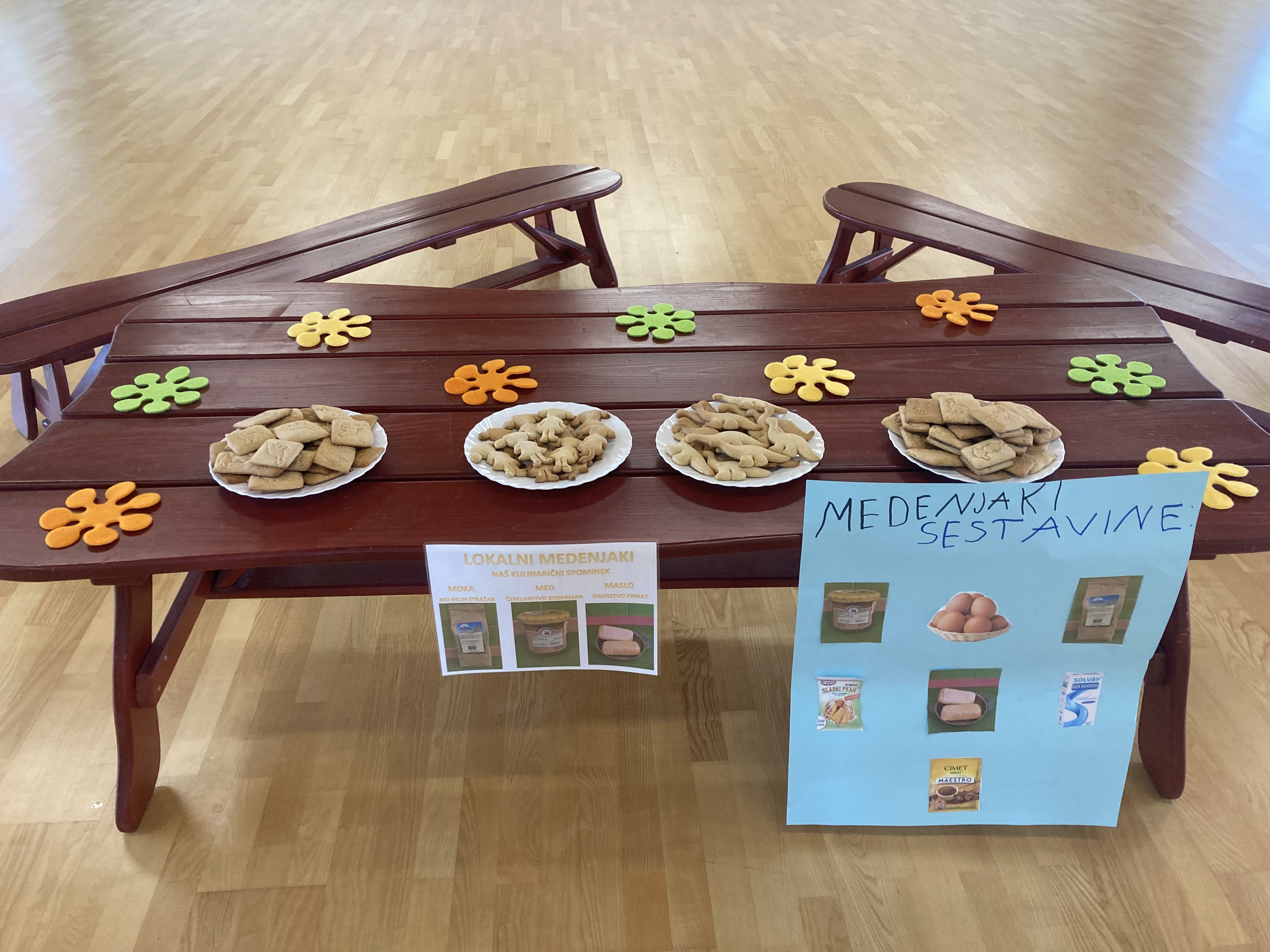 Na zaključno srečanje, ki smo ga sprva načrtovali pri lokalni trgovini Jarina, smo zaradi slabega vremena izvedli v naši večnamenski dvorani v vrtcu in sicer v torek, 21. 5. 2024. Skupaj z otroki smo izbrali fotografije vseh dejavnosti, ki smo jih v okviru projekta izvedli. Fotografije smo natisnili in plastificirali. Od vhoda v vrtec do dvorane smo na stene prilepili fotografije vseh dejavnosti, ki smo jih v okviru projekta izvedli. V dvorani smo pripravili mizo kjer so bili naši lokalni medenjaki, ki so bili v obliki Urše in dinozavra (naša maskota vrtca). Vabilu se je odzvalo kar nekaj staršev, babic in dedkov. Tudi pomočnici ravnateljici našega vrtca sta prišli. Na predstavitvi našega celoletnega projekta in kulinaričnega spominka so nas vsi zelo pohvalili.