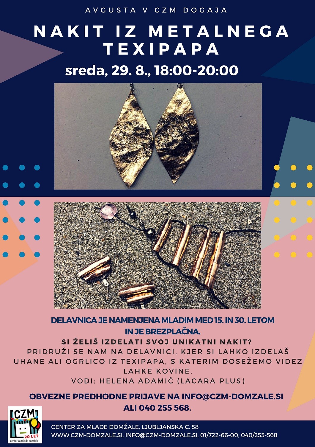 Na delavnici nakita si lahko izdelate čisto svoj nakit! Uhane ali ogrlico bomo izdelali s texipapom, s katerim dosežemo učinek lahke kovine. Delavnico vodi: Helena Adamič (Lacara Plus).