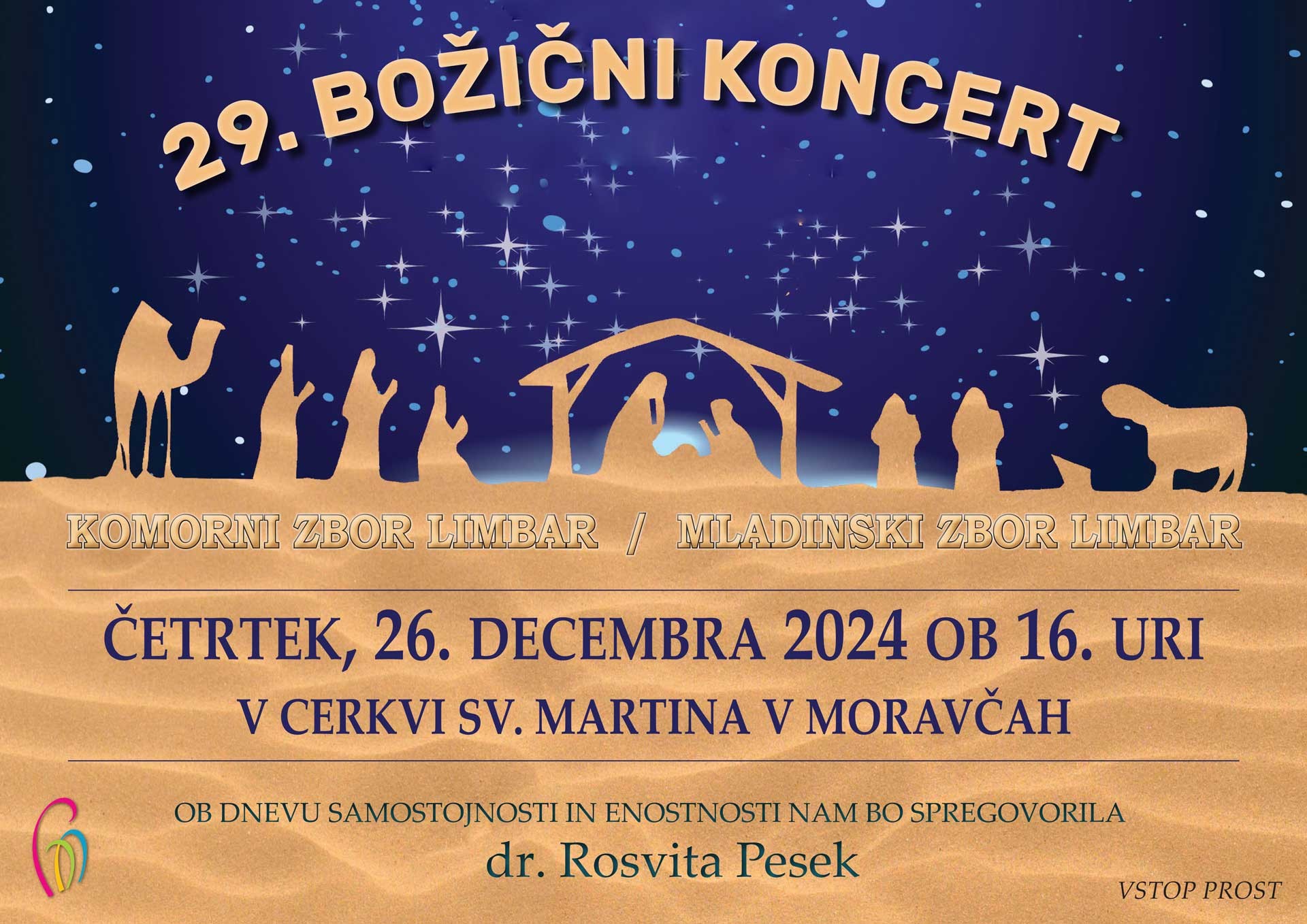 Komorni in Mladinski zbor Limbar vas vabita na čaroben božični koncert, ki bo v četrtek, 26. decembra 2024, ob 16.00 v cerkvi Svetega Martina v Moravčah.