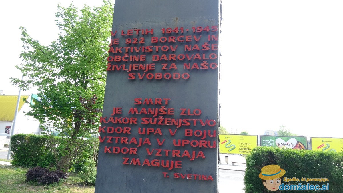 Pri spomeniku borbi in delu v parku za pošto pa se je ob spremstvu praporščaka z vencem poklonila Marija Majhenič, predsednica ZB za vrednote NOB Občine Domžale, v spomin na vse žrtve, ki so padle v Domžalah in okolici. V nadaljevanju je Igor Lipovšek spregovoril o pomenu dneva upora proti okupatorju ter nanizal nekaj dejstev o ustanavljanju čet in vodov ter odhodov v partizane iz domžalskega konca. Orisal je tudi zgodovino spomenika, katerega avtor je je pisatelj in kipar Tone Svetina. Spomenik je narejen v obliki obeliska iz starega orožja, posvečen pa borbi, delu, zmagam in spominu na devetsto dvaindvajsetim borcem in žrtvam druge svetovne vojne iz občine Domžale. Spomenik je bil odkrit leta 1975, ob 30-letnici osvoboditve. Na spomeniku je napisan tudi verz Toneta Svetina: »Smrt je manjše zlo kakor suženjstvo, kdor upa v boju, vztraja v uporu, kdor vztraja zmaguje.«