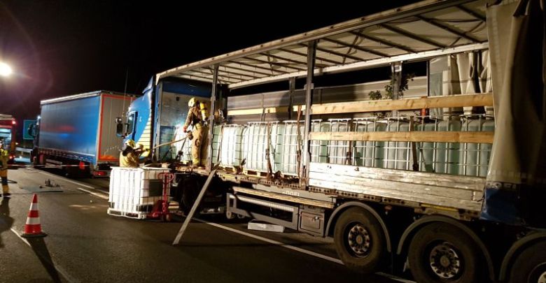 S Policijske uprave Ljubljana so nam sporočil, da so bili včeraj okoli 19. ure obveščeni o prometni nesreči na avtocesti Ljubljana – Domžale, pred izvozom Domžale, v kateri sta bili udeleženi dve tovorni vozili. Z ogledom kraja prometne nesreče in zbranimi obvestili so policisti ugotovili, da je 43-letni voznik tovornega vozila znamke Iveco, madžarskih registrskih oznak vozil po prehitevalnem pasu v smeri Domžal. Po daljšem prehitevanju je z vozilom naenkrat zapeljal v desno pred tovorno vozilo znamke Scania s pripetim priklopnim vozilom, romunskih registrskih oznak. Takrat se je kolona vozil na desnem prometnem pasu pričela ustavljati oziroma zmanjševati hitrost zaradi zgostitve prometa, 43-letnik pa je v izogib trčenju v vozilo pred njim nenadoma zavrl, 32-letni voznik Scanie pa je posledično trčil vanj. Pri trčenju je na pripetem priklopniku Scanie prišlo do poškodbe tovora (dveh plastičnih cistern v katerih se je nahajala tekočina amonijaka nitrogena). Zaradi razlitja tekočine so na kraju posredovali gasilci, ki so opravili pretok tekočine iz poškodovanih cistern in očistili vozišče.