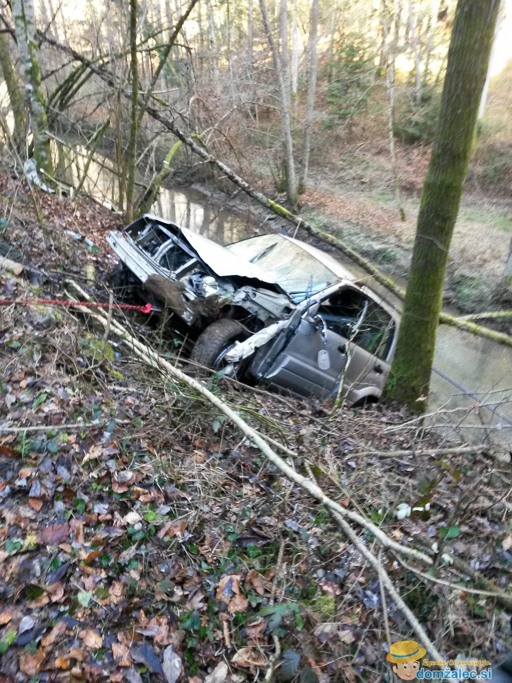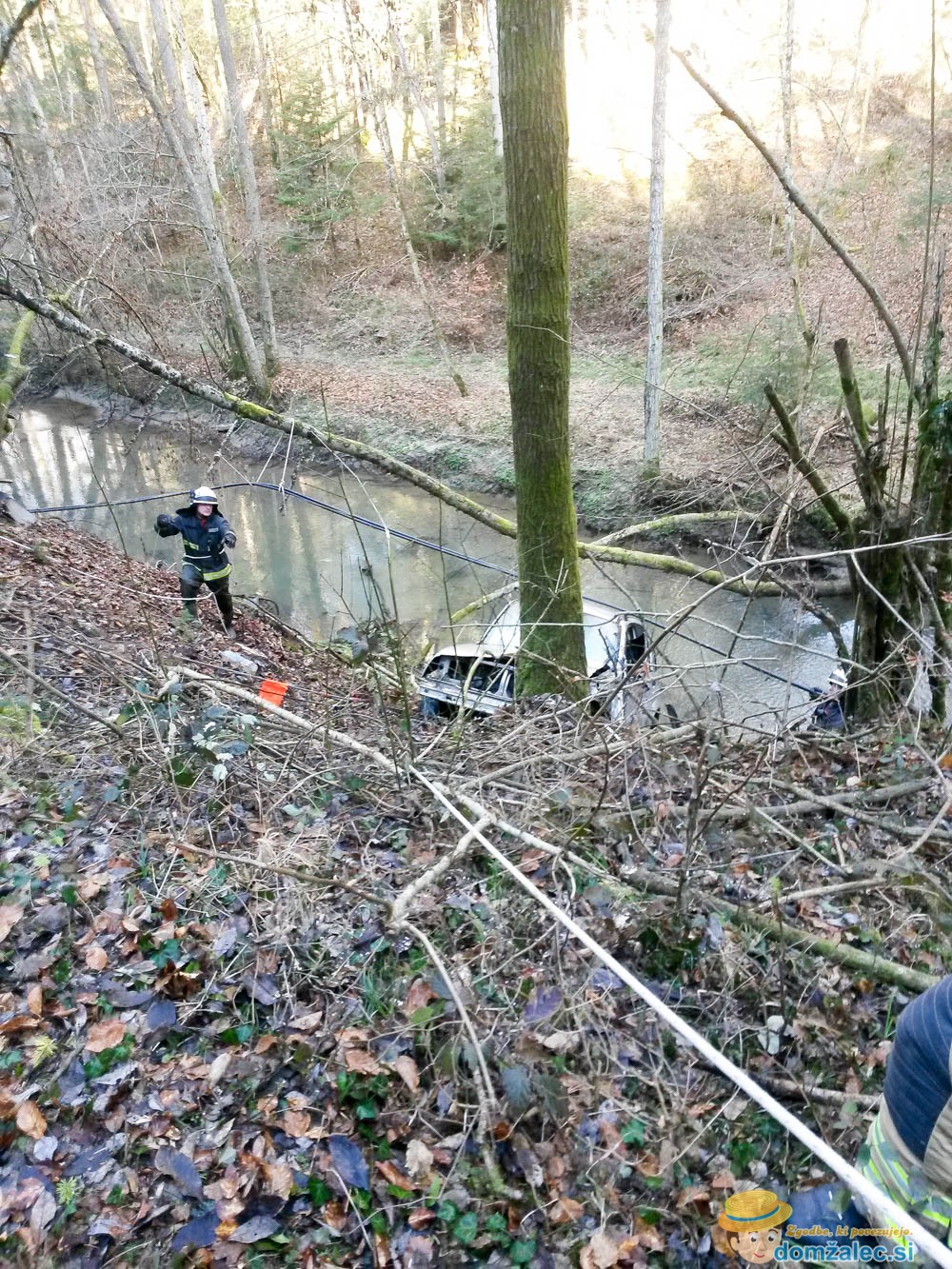 Gasilci so vozilo s tehničnim posegom potegnili iz potoka na cesto, pri tem pa jim je pomagal tudi krajan s traktorjem. So imeli pa kar nekaj dela, da so vozilo spravili iz potoka, saj je breg izredno strm, višinske razlike pa naj bi bilo okrog deset metrov.