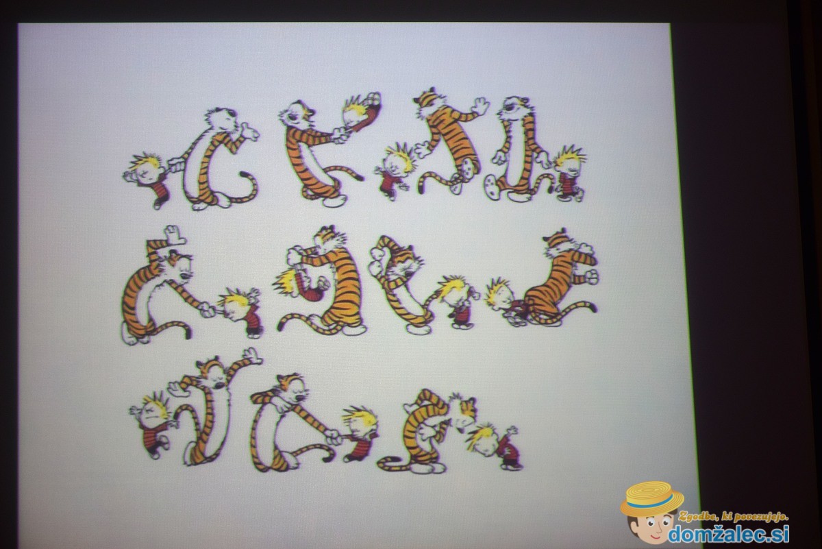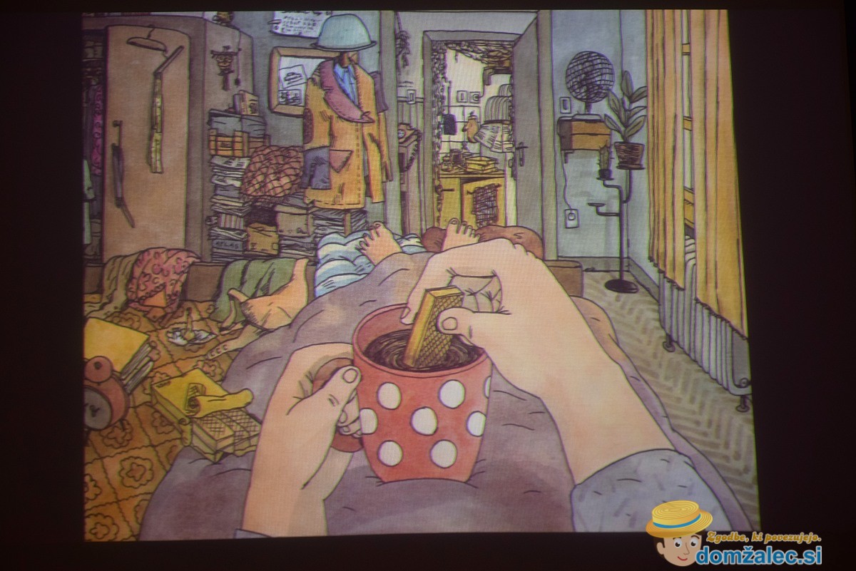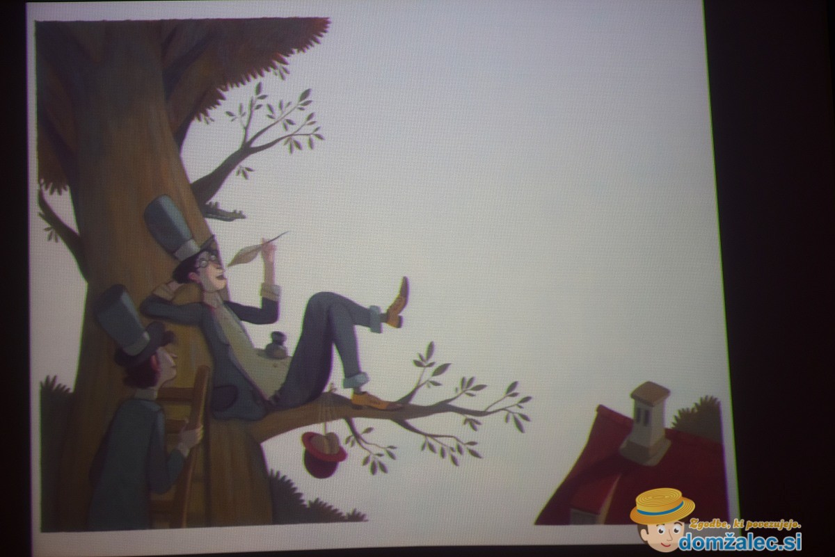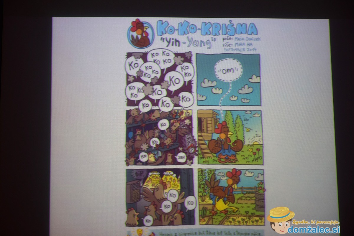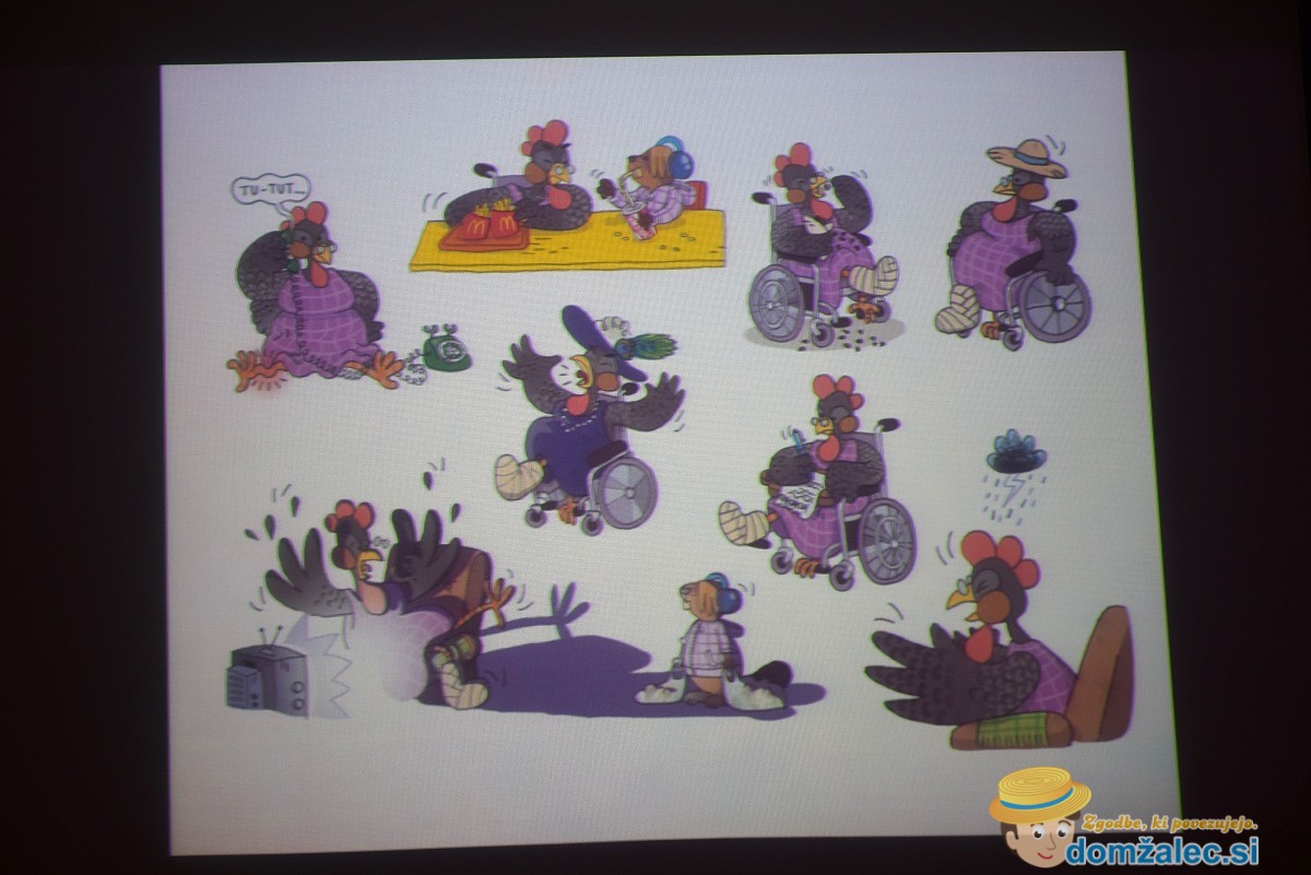 Na projekcijskem platnu smo lahko videli postopke pisanja in risanja, barvanja in vseh drugih stvari, ki pripeljejo do končnega cilja, tiska knjižice ali stripa pri založbi. Ker sta gosta tako izčrpno pripovedovala o svojem ustvarjanju, je seveda privedlo do veliko vprašanj po uradni predstavitvi, ki so jih postavljali učenci Osnovne šole Dragomelj. Gosta sta bila s pravo izbiro vprašanj kar presenečena, saj so učenci njuna dela večinoma že prebrali, zato sta vsem z navdušenjem odgovarjala o njunem ustvarjanju, izdala pa sta tudi kar nekaj skrivnosti, ki privedejo do končnega izdelka, to je slikanice ali stripa, ki jih otroci radi vzamejo v roke.