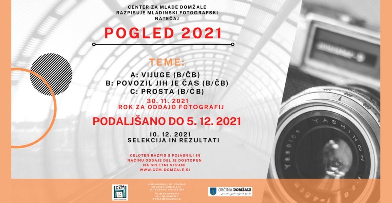 Center za mlade Domžale sporoča, da so podaljšali rok za oddajo fotografij za sodelovanje na fotografskem natečaju Pogled 2021. Svoje fotografije lahko oddate preko spletne prijavnice do nedelje, 5. decembra 2021.
