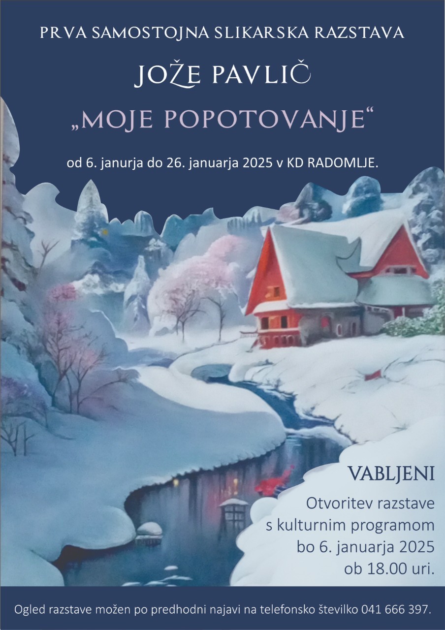Vabljeni na prvo samostojno slikarsko razstavo umetnika Jožeta Pavliča z naslovom “Moje popotovanje”, ki bo na ogled od 6. januarja do 26. januarja 2025 v Kulturnem domu Radomlje.