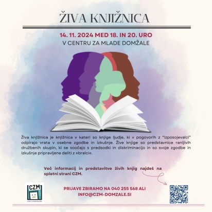 V Centru za mlade Domžale bo v četrtek, 14. novembra 2024, potekala Živa knjižnica. Vabljeni med 18. in 20. uro v prostore CZM, kjer bomo ob prigrizkih radovedno »brali« in kramljali.