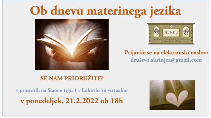 Naslednji pomemben dan v mesecu je seveda 21. februar, mednarodni dan materinega jezika. V društvu Skrinjca ga bomo obeležili z literarnim večerom: prebirali bomo kratko prozo in poezijo iz naših krajev.