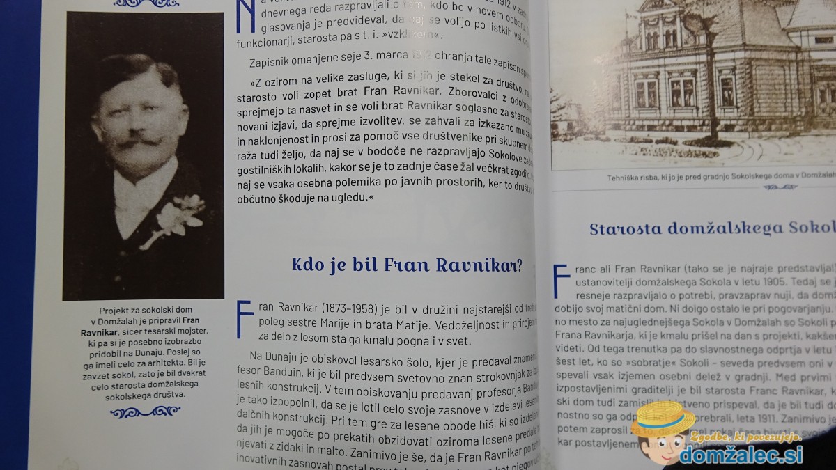 Knjiga ima dva dela. V prvem delu knjige je obdelana zgodovina delovanja domžalskih Sokolov. Avtor podrobno oriše osnovna idejna izhodišča gibanja, katerega ustanovitelj je bil Čeh dr. Miroslav Tyrš in njegov razmah v Sloveniji, saj je na začetku 20. stoletja že delovalo več kot 100 sokolskih društev. Domžalski Sokoli so bili ustanovljeni leta 1905, pri ustanavljanju pa so ključno vlogo imeli Franjo Breceljnik, Franc Majzelj, Andrej Stopar, Milan Jenčič in Bojan Drenik. Prva telovadnica društva je bila kar gostinska soba pri Slokarju, kasneje pa je bilo njihovo delovanje vrsto let dodobra zaznamovano z gradnjo svojega doma, ki ga je zasnoval Franjo Ravnikar. Žal je zgradba, ki je stala v bližini današnjega krožišča pri policiji, žalostno končala v požigu leta 1944, ko se zaključi tudi delovanje Sokolov. Leta 1909 se je pričel graditi “Sokolski dom”. Franc Ravnikar je Domžalam dal dve izjemno lepi zgradbi, ena izmed njih je Sokolski dom, drugi pa Društveni dom (danes Kulturni dom Franceta Bernika). 6. avgusta 1911 je bil Sokolski dom slovesno odprt, oba sta bila med najlepšimi v Sloveniji, žal pa je bil Sokolski dom požgan in kasneje podrt.