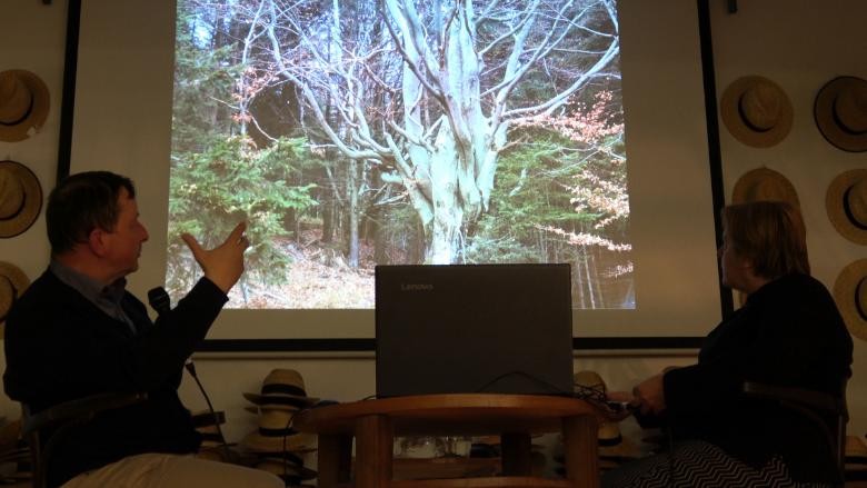 Tako je pogovor nanesel na zgodbo dreves, saj naj bi se drevesa med sabo sporazumevala, komunicirala, si pošiljala sporočila, tako da svet dreves ni samo nekaj tako tako, ampak v zadnjih letih izhaja vse več študij o sporazumevanju dreves med sabo. Vsakemu gozdarju je jasno, da drevesa v gozdu živijo v skupnosti in se obnašajo drugače, kot drevesa na odprtem prostoru. V gozdu se na primer, ko se pojavi nek škodljivec na kakšnem drevesu vključijo kemikalije, ki sporočajo drugim drevesom, da začnejo v svojem tkivu kopičiti tiste strupe za žuželke, s katerimi se lahko do določene mere obranijo. Zato je izjemno pomembno, da svet v gozdu živi v sožitju. Mahovi, glive, lišaji ter ostalo rastlinje, vse to deluje v eni skupnosti, da branijo ena drugo, brez tega naša drevesa ne bi mogla živet. Vsa drevesa, ki jih poznamo, so v sožitju z glivami, ki so podaljšek korenin, drevesni tesni trgovski partner, kjer se menja vse.