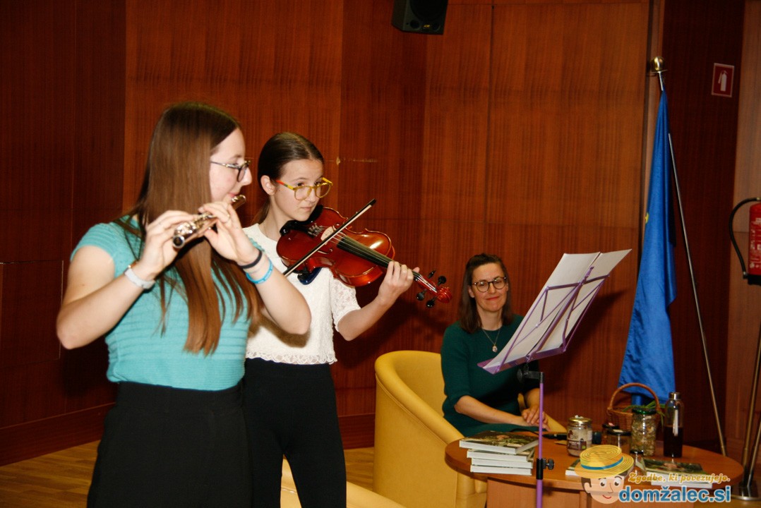 Na kulturno obarvanem večeru pa ni bilo govora le o vsebini knjig izpod peresa dr. Katje Rebolj, ampak tudi o zgodovini zeliščarjev in o starih kuharskih knjigah v katerih najdemo recepte, ki vključujejo omenjene zdravilne rastline, o prvi kuharski knjigi v slovenskem jeziku Kuharske bukve Valentina Vodnika in še in še. Po predstavitviprve knjige Narava vedno zmaga je sledil glasbeni premor, kjer sta nam Tina in Anja zaigrali na violino in flavto, da smo se ob sproščujoči skladbi pripravili na drugi del predavanja.