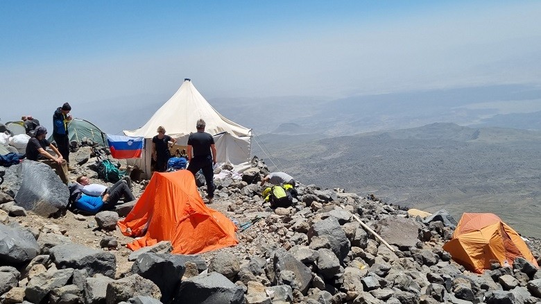Pot do vrha je še malo bolj strma, sem in tja se je bilo treba prijeti za kakšno skalo … Višje si, težje je dihanje, zato smo potrebovali več pavz, da smo se nadihali. Na približno 5000 metrih smo si nataknili dereze in se podali proti zasneženemu vrhu. Takrat smo bili že srečni, saj je vsak pri sebi vedel, da je to to in da bomo vsi uspešno stopili na tega pettisočaka. Na vrhu Ararata je bilo glede na napoved približno 0 stopinj Celzija, veter je pihal okoli 40-50 km/h, zato je bil občutek mraza nekje med -10 in -15 stopinj. Ob 7.00 smo stali na vrhu – vsi, celotna ekipa! Nebo je bilo brez oblačka, res smo imeli srečo!