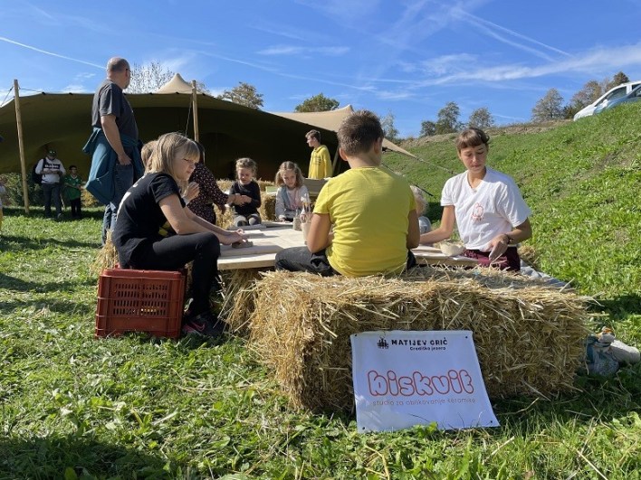 Medtem ko so se otroci s svojimi sankami zapodili na s slamo ‘prevlečen’ grič, pa tudi v labirint, ki jim je bil letos še nekoliko bolj zanimiv (in tudi zahtevnejši – čestitke mladima arhitektoma Jakobu in Albertu!) kot lani, se metali po slamnatem bazenu, mlajši in še sploh malčki, pa zavzeto ustvarjali z Biskvitom, so odrasli posedali na slamnatih kockah in uživali v prijetnem druženju na soncu, kar se je po deževnem (in posledično celo poplavnem) obdobju še kako prileglo.