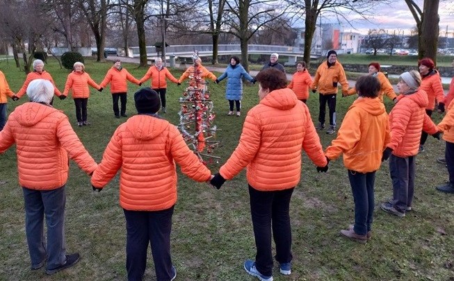 Tokrat je bilo pri postavljanju božično-novoletnega drevesca še posebej zanimivo, saj je vsak član skupine s seboj prinesel obesek s svojim imenom in ga obesil na drevesce. Naj drevesce v veselje telovadcem in sprehajalcem ob Kamniški Bistrici v miru stoji do konca praznikov.