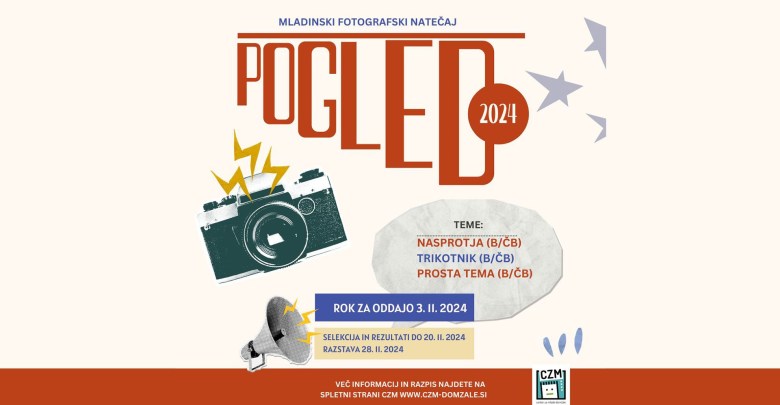Fotografski natečaj POGLED poteka v organizaciji Centra za mlade Domžale in ima letos prav posebno obletnico, saj praznuje 10. leto. Teme letošnjega natečaja so: NASPROTJA, TRIKOTNIK in PROSTA tema. Sodelujete lahko v vseh treh temah, z do 4 fotografijami na posamezno temo, v barvni ali črno-beli tehniki.