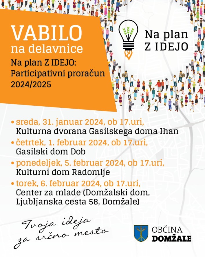 Termini delavnic »Na plan Z IDEJO: participativni proračun Občine Domžale 2024/2025« so: