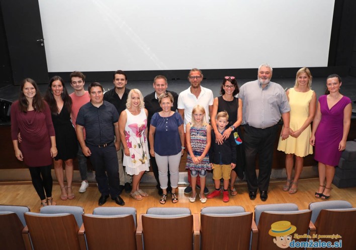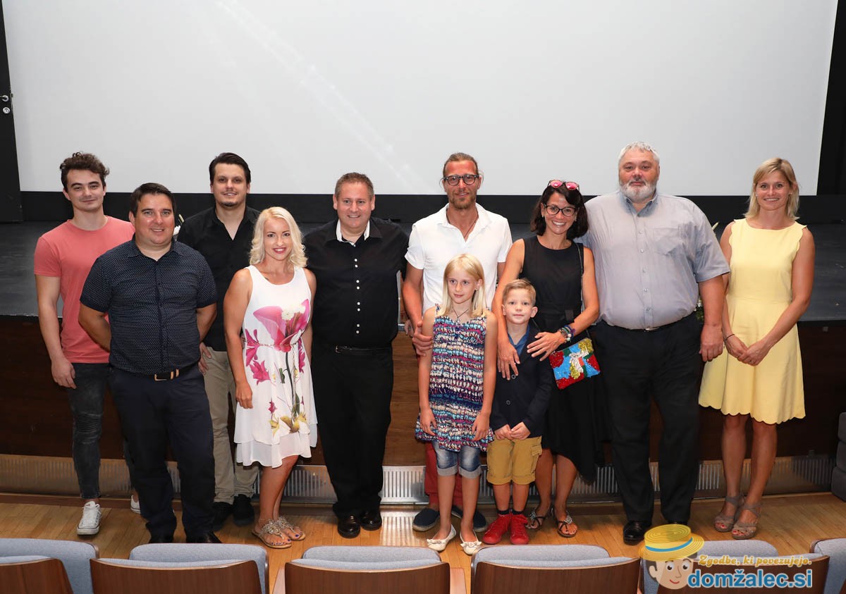 Skupinska fotografija ustvarjalcev filma z županom in podžupanjo.