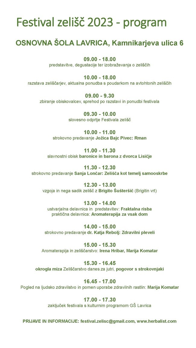 Novost letošnjega festivala je aromaterapija, ki bo predstavila recepte za vsakodnevno uporabo doma in pokazala nekaj praktičnih izkušenj za lažje življenje. Brigita Šušteršič bo pokazala kako negovati rastline. Z nami bosta Metoda Leban Dervišević in Lucija Hudoklin, ki bosta navdušili starejše in mlade udeležence s Fraktalno risbo. Nekaj bomo povedali tudi o zeliščih kot kulturni dediščini, za katero skrbimo tudi v društvu Skrinjca. Za zaključek festivala smo pripravili strokovno okroglo mizo, kjer strokovnjaki pomagajo razvijati pozitivno okolje za ljubitelje in profesionalne zeliščarje. Prav vsem je namenjen ta dan. Vabljeni za krajši čas ali celoten dogodek.