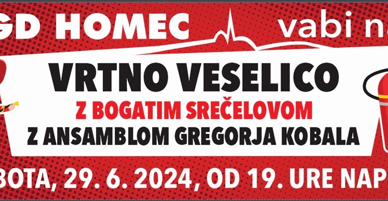 V soboto, 29. junija 2024 homški gasilci prirejajo veliko gasilsko vrtno veselico na kateri bo za dobro voljo in znucane podplate zopet skrbel ansambel Gregorja Kobala. Za lačne trebuščke in suha grla pa bodo poskrbeli homški gasilci.