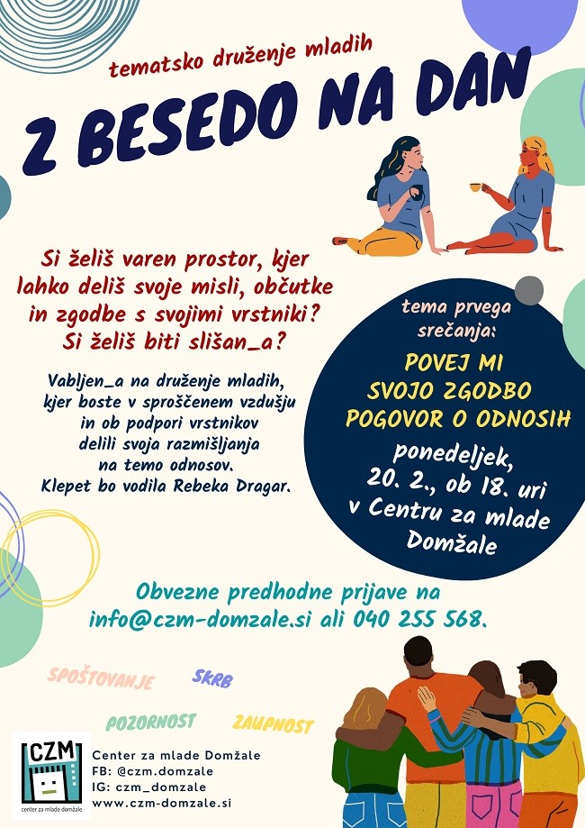 Tema prvega druženja bo »Povej mi svojo zgodbo – pogovor o odnosih« in bo potekalo v ponedeljek, 20. 2. 2023, ob 18. uri, v Centru za mlade Domžale.
