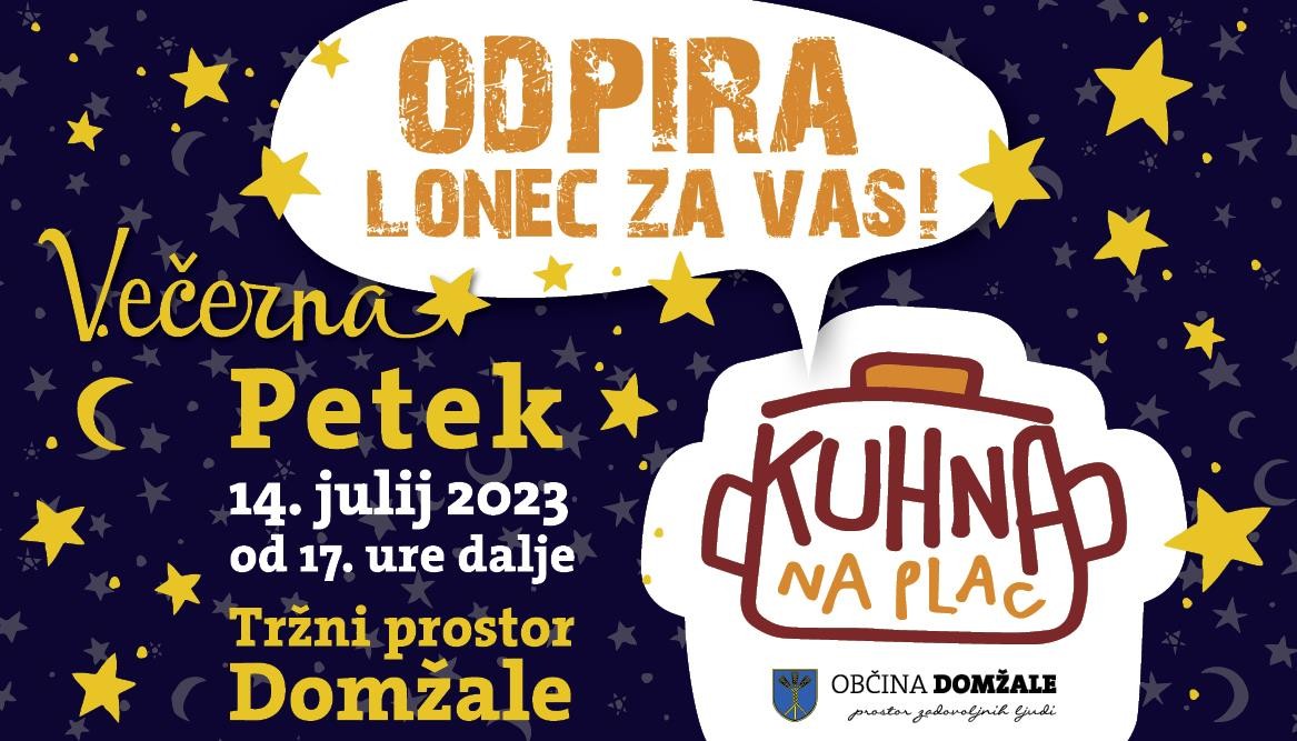 V petek, 14. julija 2023, se od 17. ure dalje na tržni prostor v Domžale pred kratkim poletnim oddihom vrača Kuhna na plac v večerni preobleki. Poleg kulinarične ponudbe hrane in pijače bo glavni poudarek na druženju.