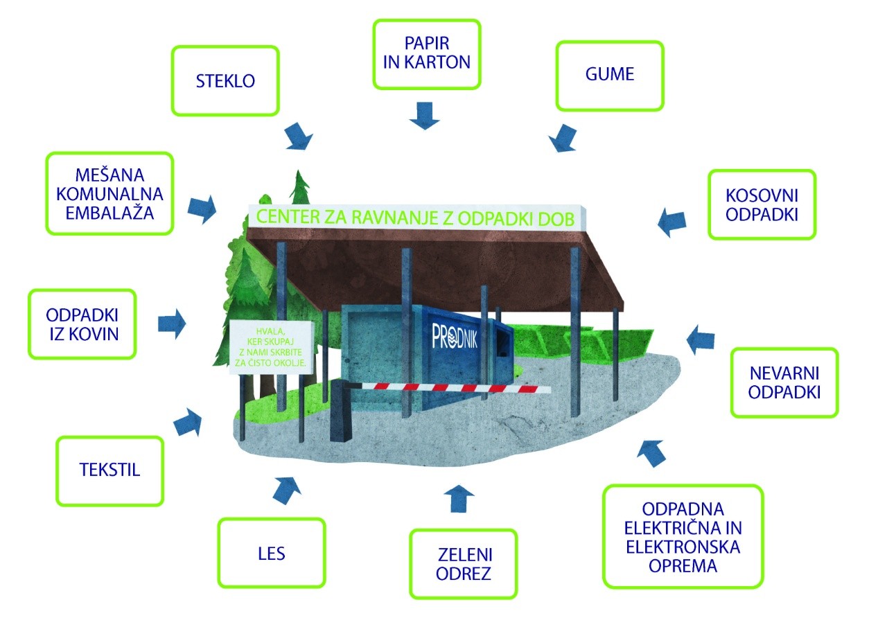 Prevzem ločeno zbranih odpadkov (embalaže, papirja, stekla, kosovnih in nevarnih odpadkov, tekstila, odpadne električne in elektronske opreme) je za gospodinjske uporabnike brezplačno zagotovljen v Centru za ravnanje s komunalnimi odpadki Dob. Lokacijo, delovni čas in informacije o predaji odpadkov preverite na spletni strani.