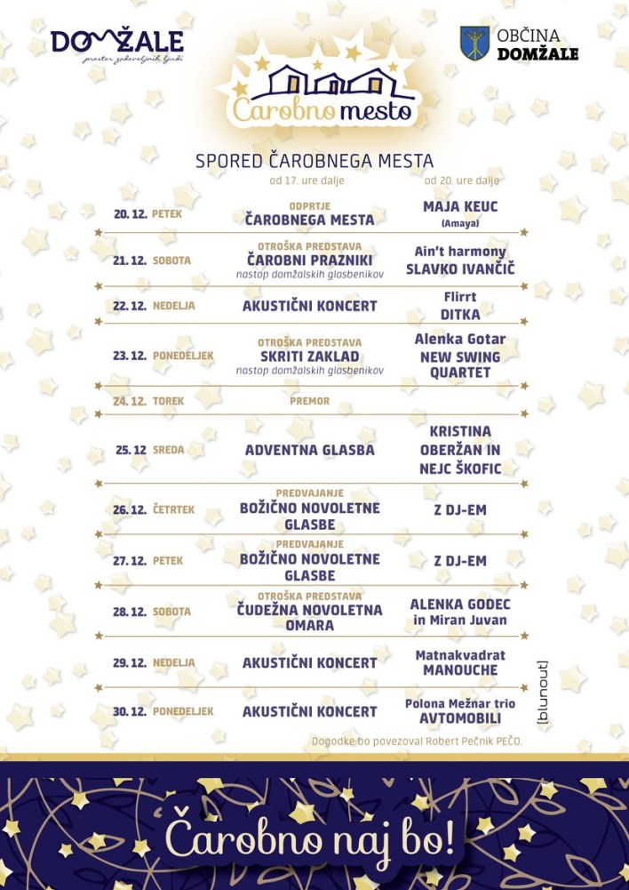 Slamnikarski park v Domžalah se je danes ob 17. uri spremenil v Čarobno mesto, z ličnimi lesenimi hišicami, kjer je na voljo različna ponudba. Svojo čarobnost dodaja tudi paviljon, v katerem bo potekal glasbeni program in pa tudi program za otroke. Program, ki ga je v sodelovanju z Občino Domžale pripravil Blunout klub je namreč oblikovan po okusu za vse generacije – za otroke, mladino in starejšo publiko. Glasbeno dogajanje se bo začelo ob 20. uri z nastopom Maje Keuc, še pred tem bo na sporedu uradno odprtje s prižigom prazničnih luči, ki bodo razsvetljevale Čarobno mesto. Čarobno mesto bo odprla podžupanja mag. Renata Kosec. Vse dogodke bo povezoval Robert Pečnik – Pečo.