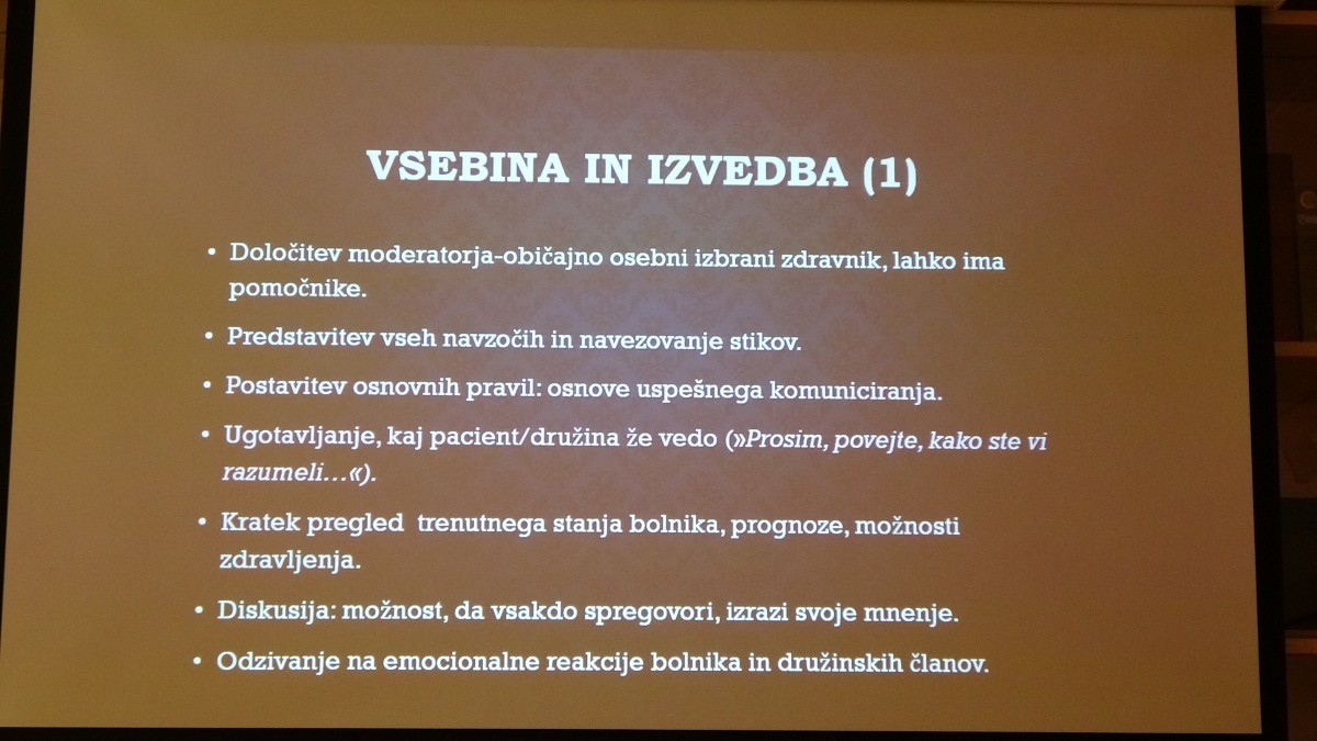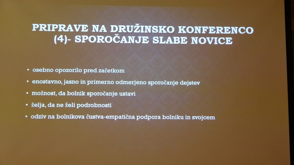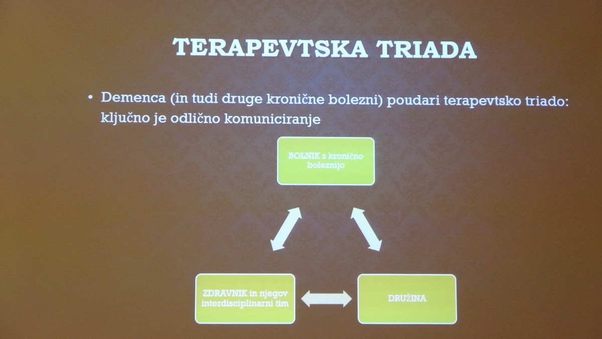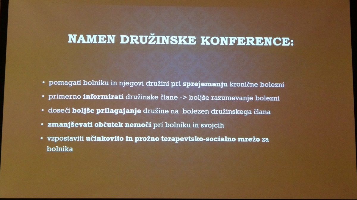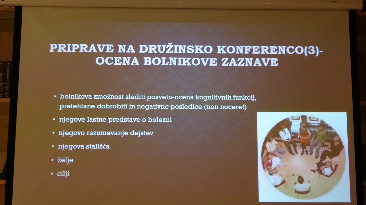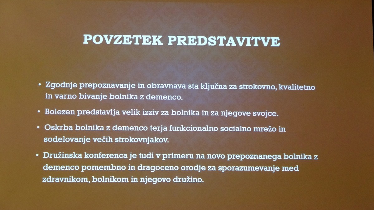 Pravočasno prepoznavanje in kar se da hitra obravnava Alzheimerjeve bolezni sta ključna dejavnika za učinkovito soočanje z boleznijo. Le-ta hkrati prizadene bolnika in vso njegovo družino. V predavanju je bil poudarek na možnostih prepoznave bolezni, saj je vedno okolica bolnika tista, ki znake prepozna prva. Osvetlili so tudi možne vire pomoči, podpore in načine zdravljenja v našem okolju. Bolniki z Alzheimerjevo boleznijo in njihovi svojci bi se morali zavedati, da v življenju z Alzheimerjevo boleznijo niso sami, in da obstaja pomoč. Namen družinske konference je pomagati bolniku in njegovi družini pri sprejemanju kronične bolezni, pri primernem informiranju družinskih članov za boljše razumevanje bolezni, boljšem prilagajanju družine na bolezen družinskega člana ter zmanjševanju občutka nemoči pri bolniku in svojcih. Pomoč pri vzpostaviti učinkovite in prožne terapevtske, socialne mreže za bolnika.