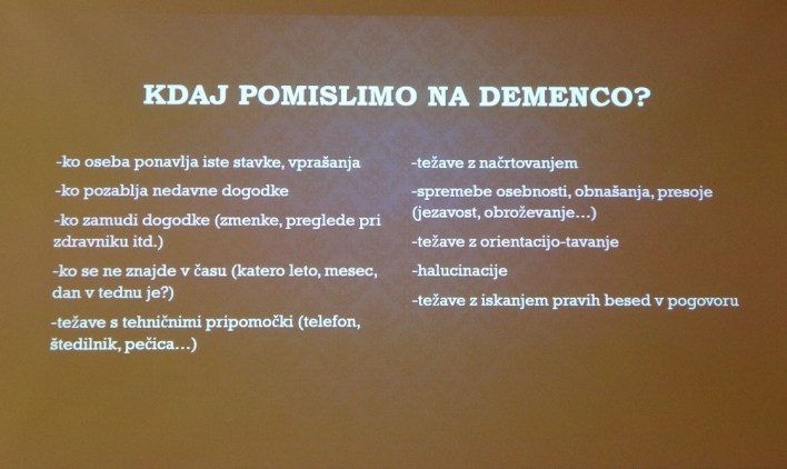 Tokratna tema je bila demenca v začetni fazi in njena napredujoča oblika. Kako se lotit težavnih situacij in opredeliti družinske konference, to je družinskega sestanka kot posebne oblike komuniciranja, prepoznavanje psihičnih motenj v starosti, viri pomoči in oskrbe bolnika z demenco ter vsebina in izvedba družinske konference.