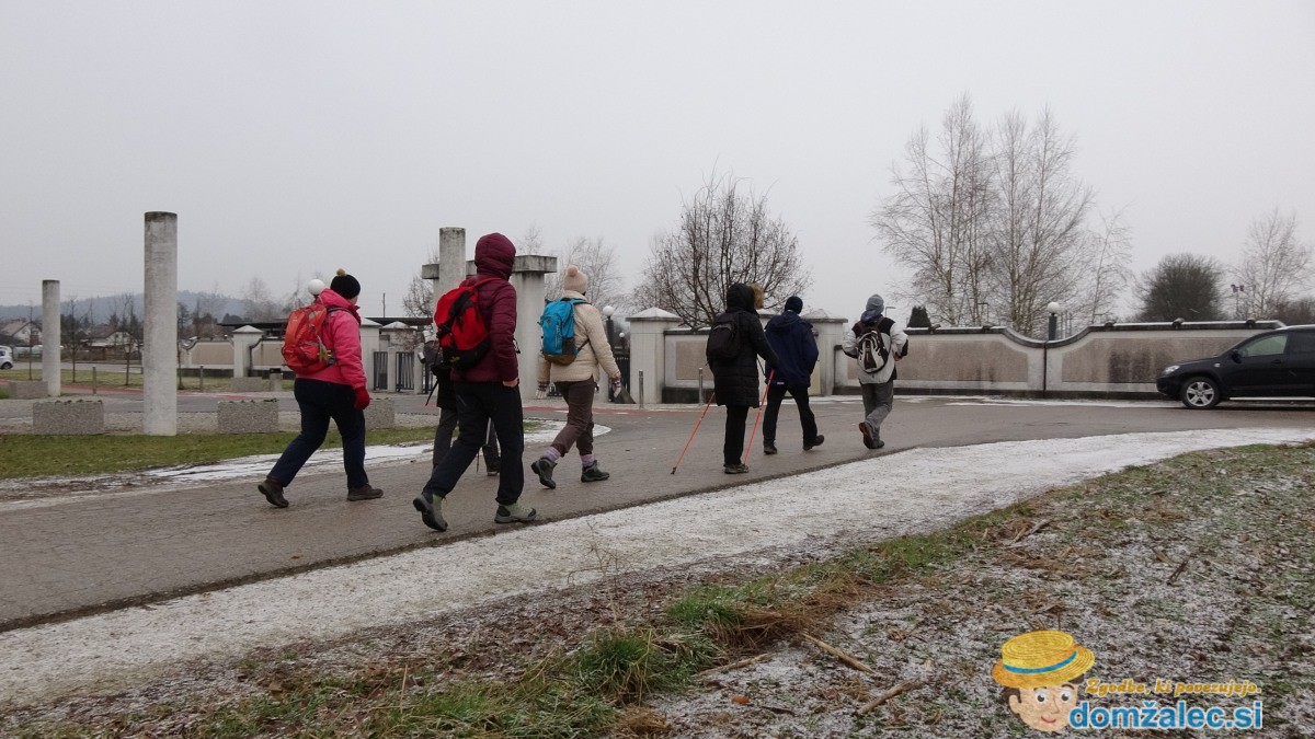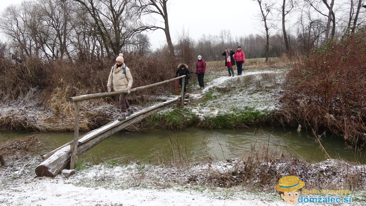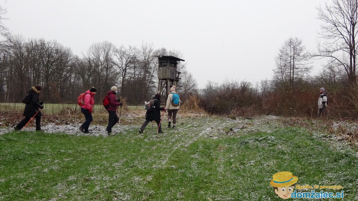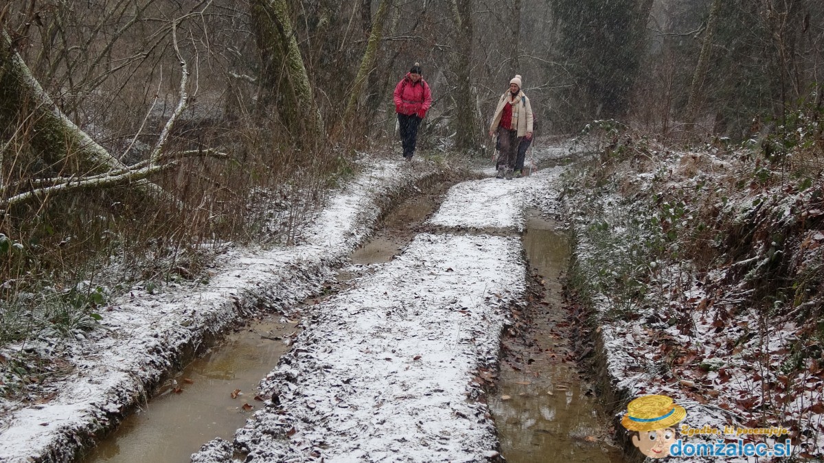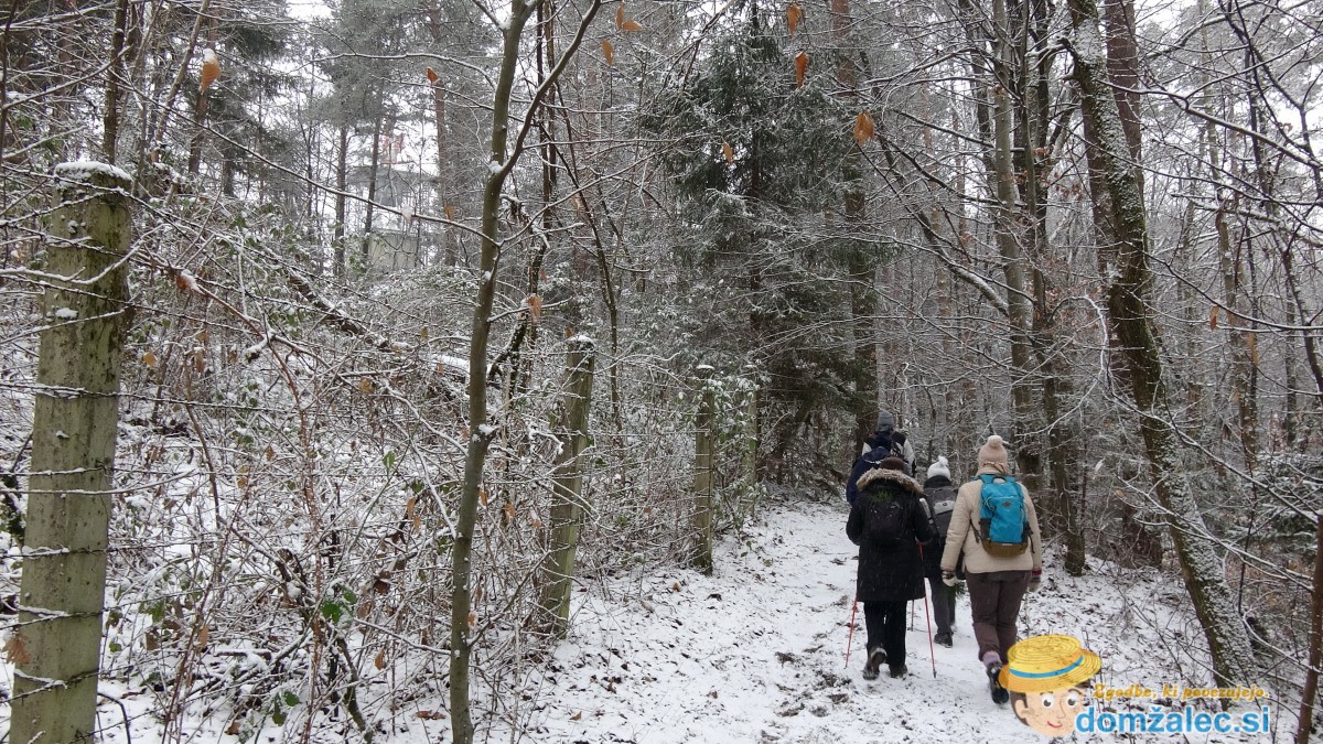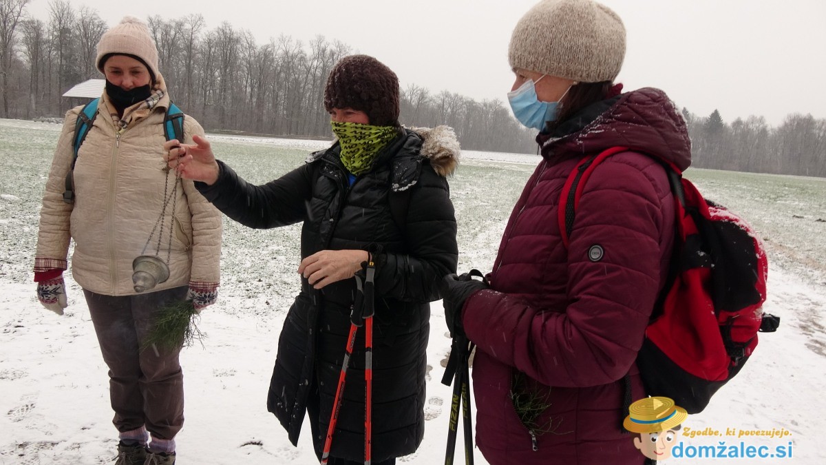 V nedeljo, 10. januarja 2021, smo se ob pol dvanajstih odpravili peš od domžalske cerkve po poteh, ki vodijo ob strugah manjših potočkov proti Podgoriškim hribom. Sneg je naletaval, kakih sto metrov od nas se je mirno pasla čreda srn in srnjakov, ki smo jih za hip zmotili pri paši, saj so nas radovedno gledale, zatem pa se premaknile na bolj varno razdaljo in naprej mulile travo, ki so jo izbrskale izpod tanke snežne odeje. Manjši potočki ob poti se zlivajo v Pšato, ki smo jo po provizorični brvi prečkali in kar hitro smo bili pod podgoriškimi hribi.