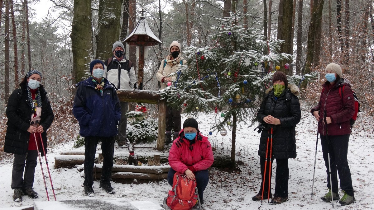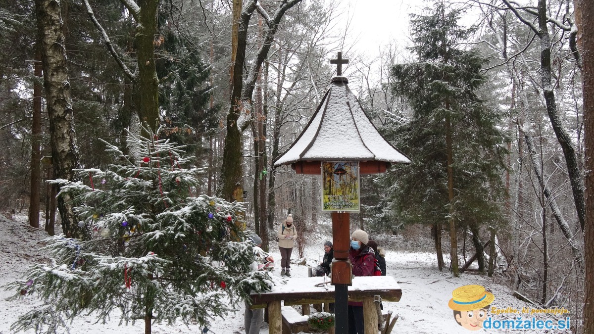 Rahlo je naletaval sneg, veter je pihljal, a smo se s hojo lepo greli. Pod daljnovodi smo se za hip ustavili, saj smo poslušali prasketanje električne energije, ki teče po žicah. Na skavtskih ZOOM srečanjih imamo letos temo o elektriki in strelah. Povzpeli smo se na pobočje hriba Strašnjak, na višino daljnovoda, kjer smo še bolj razločno slišali prasketanje elektrike v žicah. Če bi bil lep razgled, bi se videlo vse od Murovice, Kamniško Savinjskih Alp, Karavank do Triglava, a smo bili zaradi sneženja prikrajšani za razgled. Odpravili smo se naprej, kmalu pa se je pred nami pojavil naš prvi hrib Strašnjak (365 m). Ker je vrh v gozdu, kjer prevladujejo bori in kostanji, smo se odpravili naprej do Oljske gore (401 m), kjer so nas pričakale lepo postavljene jaslice, kar trije zvončki, križ z Križanim, ob katerem je bilo lepo okrašeno božično drevesce, gugalnica in seveda masivna miza s klopmi, kjer smo si privoščili priboljšek, saj smo od doma odšli še pred kosilom.